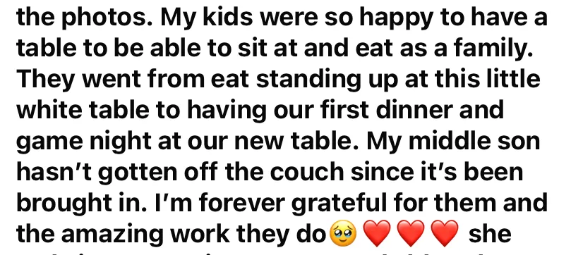 "My God sent the table and two angels to deliver into my home. Thank you"